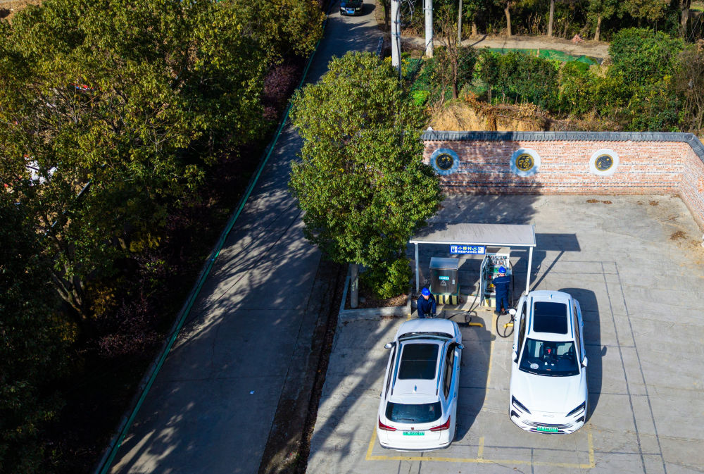 2026年1月11日,国网鄂州供电公司工作人员对鄂州市鄂城区西山街道小桥村充电站的充电设备进行巡检(无人机照片)。新华社记者肖艺九摄