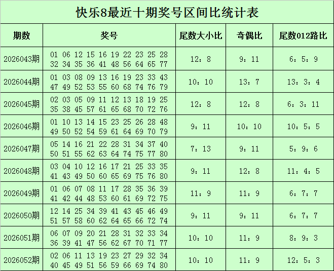 福彩惬心8第2026052期开奖回想:02 06 11 13 19 23 27 29 32 34 40 45 49 51 56 59 66 69 74 80,其中奖号余数奇偶比为11:9,余数大小比为10:10,余数012路比为12:5:3。