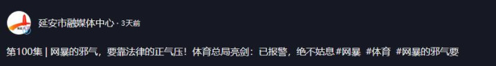 【1】2026年4月10日发布 延安市融媒体中心《第100集 |网暴的邪气,要靠法律的浩气压!体育总局亮剑:已报警,毫不姑息#网暴#体育#网暴的邪气要》