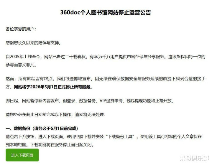 即日起,360doc 暂停新实质发布,但登录、数据备份、VIP 退费苦求以及钱包提现功能均平常绽开。