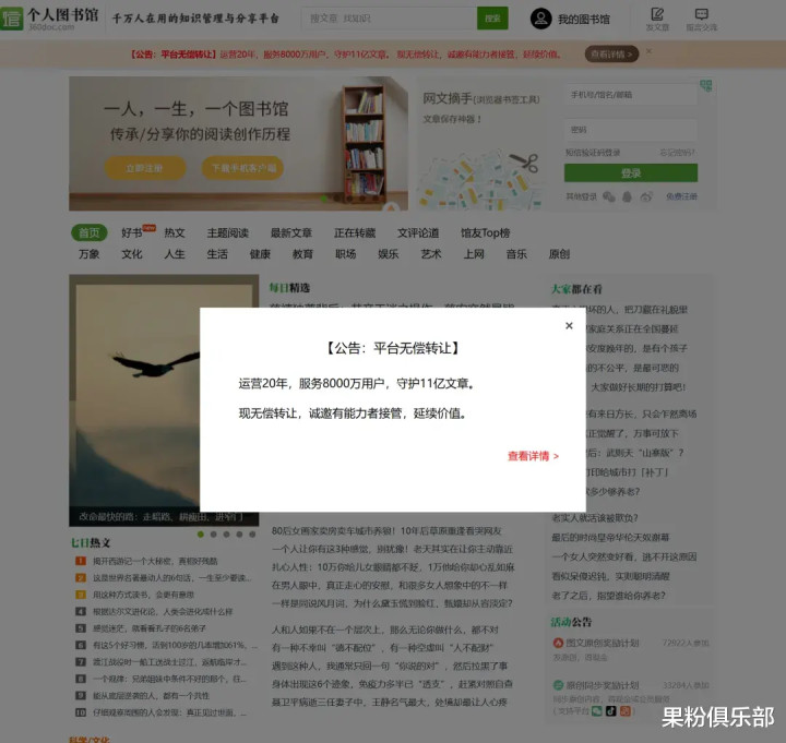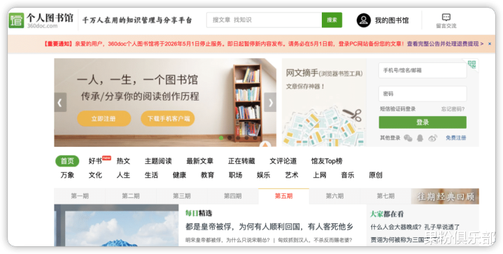近日,360doc 个东谈主藏书楼网站在官网发布了一纸停运公告。