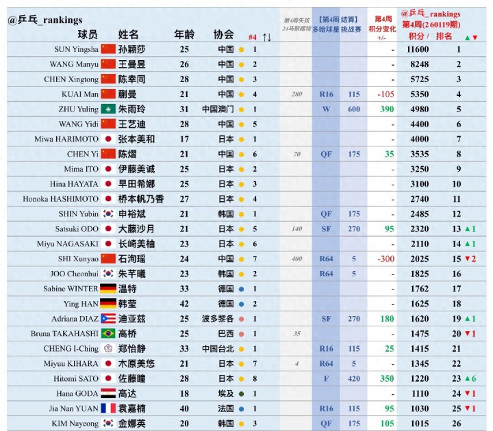 随着WTT多哈球星挑战赛的结束,女单的世界排名又进行了更新。在2026年第四周的世界排名当中,排名世界前四位的依然都是国乒选手。孙颖莎和王曼昱排名前两位,陈幸同以5742分排名世界第三。蒯曼这次止步女单16强,而马斯喀特站挑战赛她的积分到期,清除掉了105个积分,以5350分排名第四。