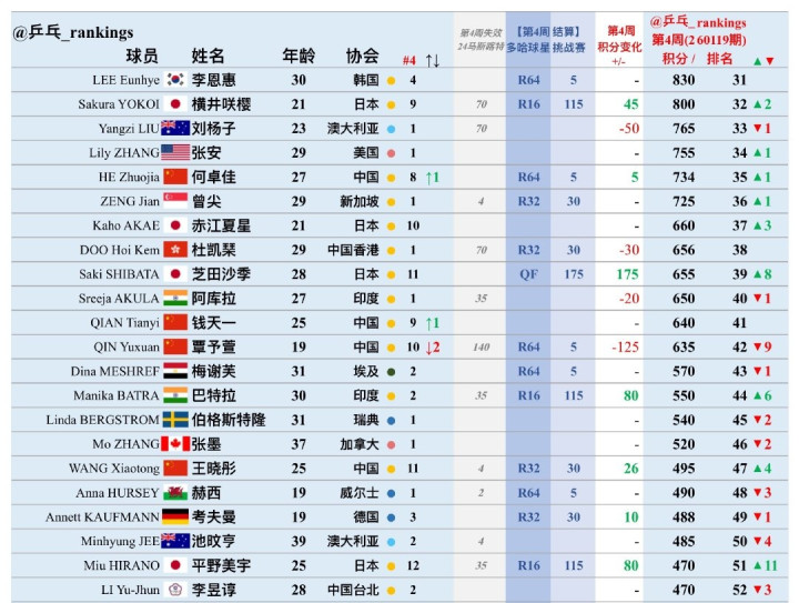 韩国选手金娜英由于击败了平野美宇,打进了八强,拿到了105个积分世界排名第26位。横井咲樱打进了挑战赛的16强,新增了45个积分,排名上升两位来到了第32名。芝田沙季打进女单八强,拿到了175个积分之后排名上升了八位,目前世界排名第39位。芝田沙季还把朱雨玲给拖到了决胜局,正手的进攻能力很出色。