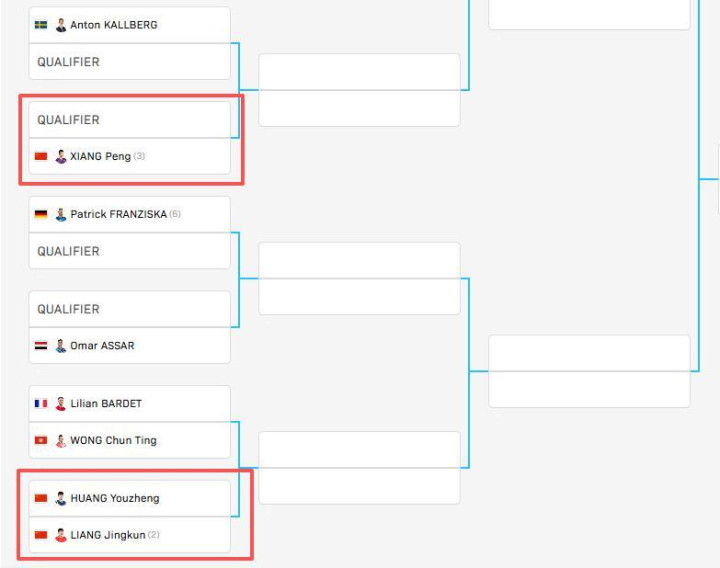 而在下半区,国乒也至少有4人,向鹏和陈垣宇都将在首轮碰到资格赛的选手,而他们最快也将在第3轮相遇,而梁靖崑和黄友政的签位就非常巧合了,两人直接就在首轮相遇了!