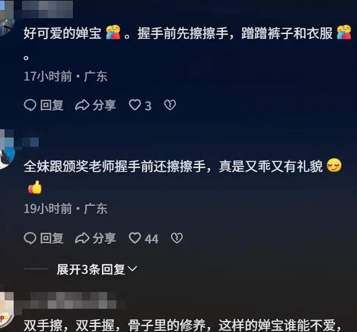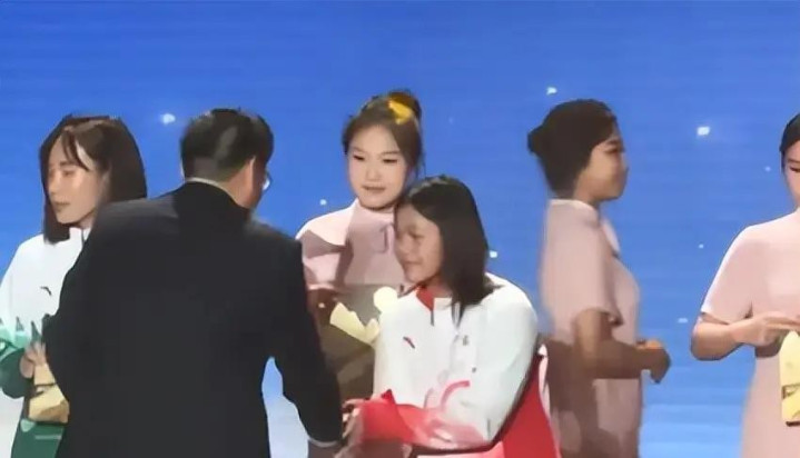 表彰大会她被点名时乖巧地走上台领奖,接过证书时细心地擦了下手,这个小动作也凸显出她的质朴与教养,网友在社交媒体上为她点赞。颁奖完后她又变身“热心小助理”将水递给其他运动员,下台后又与伙伴们互动。她当天身穿粉色毛衣,戴着淡蓝色帽子,活力满满,完全就是一个18岁的青春少女。她与刘景扬的互动也让我们看到了她真实、鲜活的一面,给人很温暖的感觉。