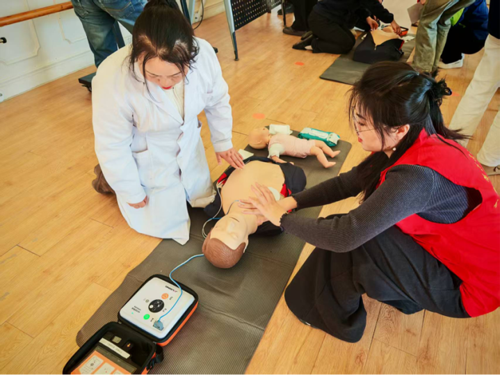 实操演练环节,志愿者团队携带仿真人体模型、AED训练机等专业教具,将教职工分组开展实战练习。魏文强导师与志愿者全程巡回指导,手把手纠正按压姿势不规范、施力角度偏差等问题,耐心解答“急救时是否优先拨打120”“幼儿惊厥能否强行按压肢体”等疑问,确保每位参训教职工都能熟练掌握操作细节,实现从理论认知到实操应用的转化。