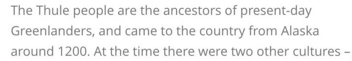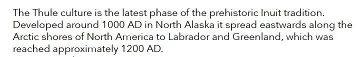 格陵兰博物馆与档案馆则称,“图勒人是现今格陵兰人的祖先,约于1200年从阿拉斯加迁徙至此。当时该地区还存在着另外两种文化——晚期多塞特文化和北欧文化。”