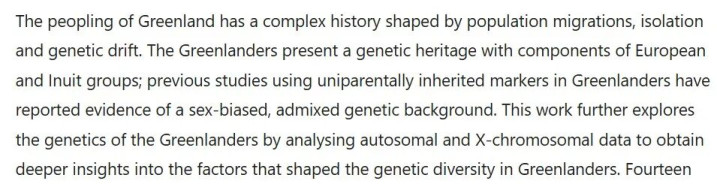 另外,学界观点认为,格陵兰人的遗传背景融合了欧洲人和因纽特人的基因成分。从全球人口的角度来看,格陵兰人与大多数人群存在显著差异,但在遗传上与阿拉斯加的一些因纽特人群体更为接近,格陵兰人口中约80%含有因纽特人成分。