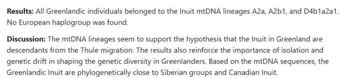 2016年,有研究表明,其检测样本中,所有格陵兰岛个体均属于因纽特人线粒体DNA谱系A2a、A2b1和D4b1a2a1,表明其祖先是图勒文化群体,而不是其他族群混血。