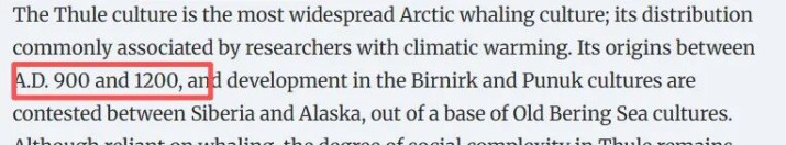 《牛津史前北极手册》2016年的刊文认为,图勒文化起源于公元900年至1200年间,其发展历程在西伯利亚和阿拉斯加之间存在争议,但都源于古老的白令海文化。