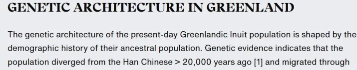 如前文所述,古因纽特人群由东北亚迁徙,经过白令陆桥,之后到达格陵兰岛附近,而此处的“东北亚”准确称谓应为“史前东北亚”,与现今中国东北和亚洲东北部等概念都有一定差别,通常指末次冰期在西伯利亚东部、外贝加尔、远东和白令陆桥一带的史前部落,而非任何中世纪或有文字记录后历史时期的东亚国家或民族。