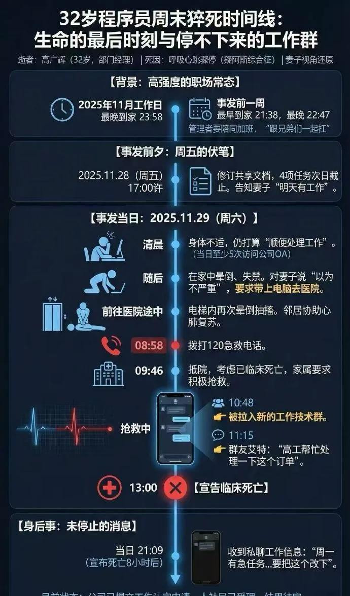 {jz:field.toptypename/}他死前一晚还在改部门共享文档,里面四个任务都标着“截止日期:11月29日”。手机浏览器缓存能查到,当天至少五次登录公司OA系统,时间没显示,但页面停留痕迹还在。抢救时被同事拉进新工作群,群里直接@他处理订单;人走了八小时后,还有同事私聊问:“周一有急任务,要把这个改下。”