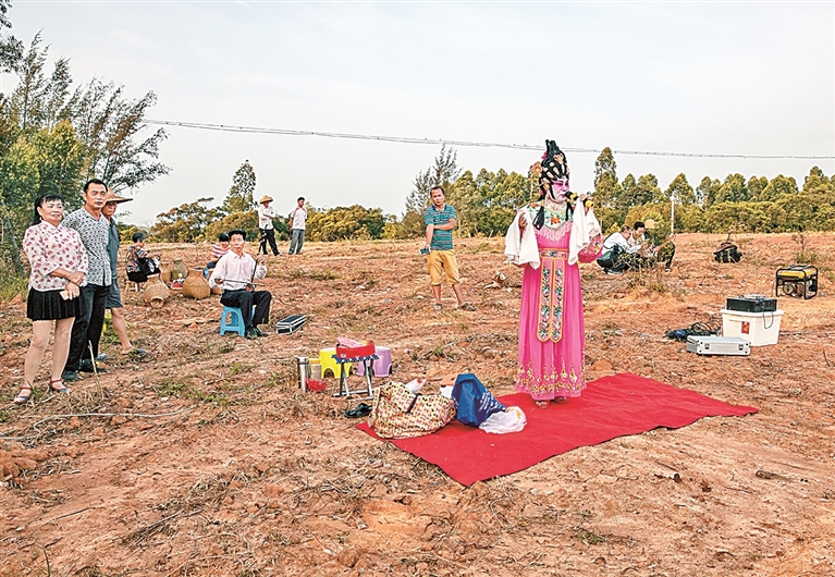 文艺轻骑队的雷剧演员在田间地头为乡亲们上演。