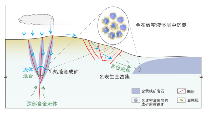 △热液成矿与表生富集过程中致密液体层内金富集的示意图