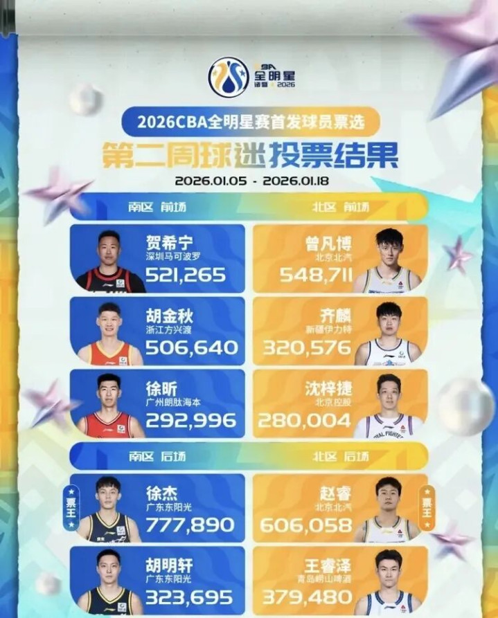 北京时间1月19日,CBA常规赛如火如荼,不过就在此刻,CBA全明星投票第二周结果正式出炉了。南区前场排名前六的球员分别是深圳队的贺希宁521265票、广厦队的胡金秋506640票、广州队的徐昕292996票、南京同曦队的郭昊文257307票、广东队的萨林杰225702票、深圳队的周鹏205711票。南区后场排名前四的球员分别是广东队的徐杰777890票、广东队的胡明轩323695票、江苏队的庞峥麟319611票、广州队的郭艾伦292292票。