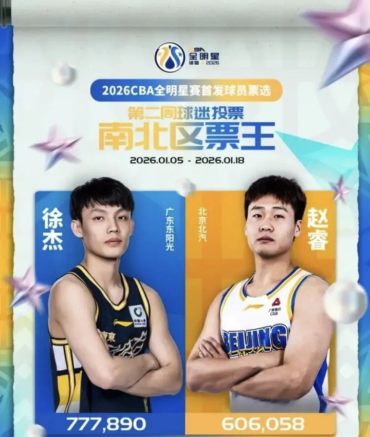 这样一来,从南北区球员获得总票数来看,CBA全明星第二周的首发球员就出炉了。南区首发球员分别是徐杰、贺希宁、胡金秋、胡明轩和徐昕,北区首发球员分别是赵睿、曾凡博、王睿泽、齐麟和沈梓捷。而徐昕也是头一次在第二周票选结果中,进入到首发的资格。需要注意的是,目前南北区首发球员有7名球员是广东全运会阵容的球员,他们分别是胡明轩、徐杰、赵睿、贺希宁、王睿泽、沈梓捷和徐昕。